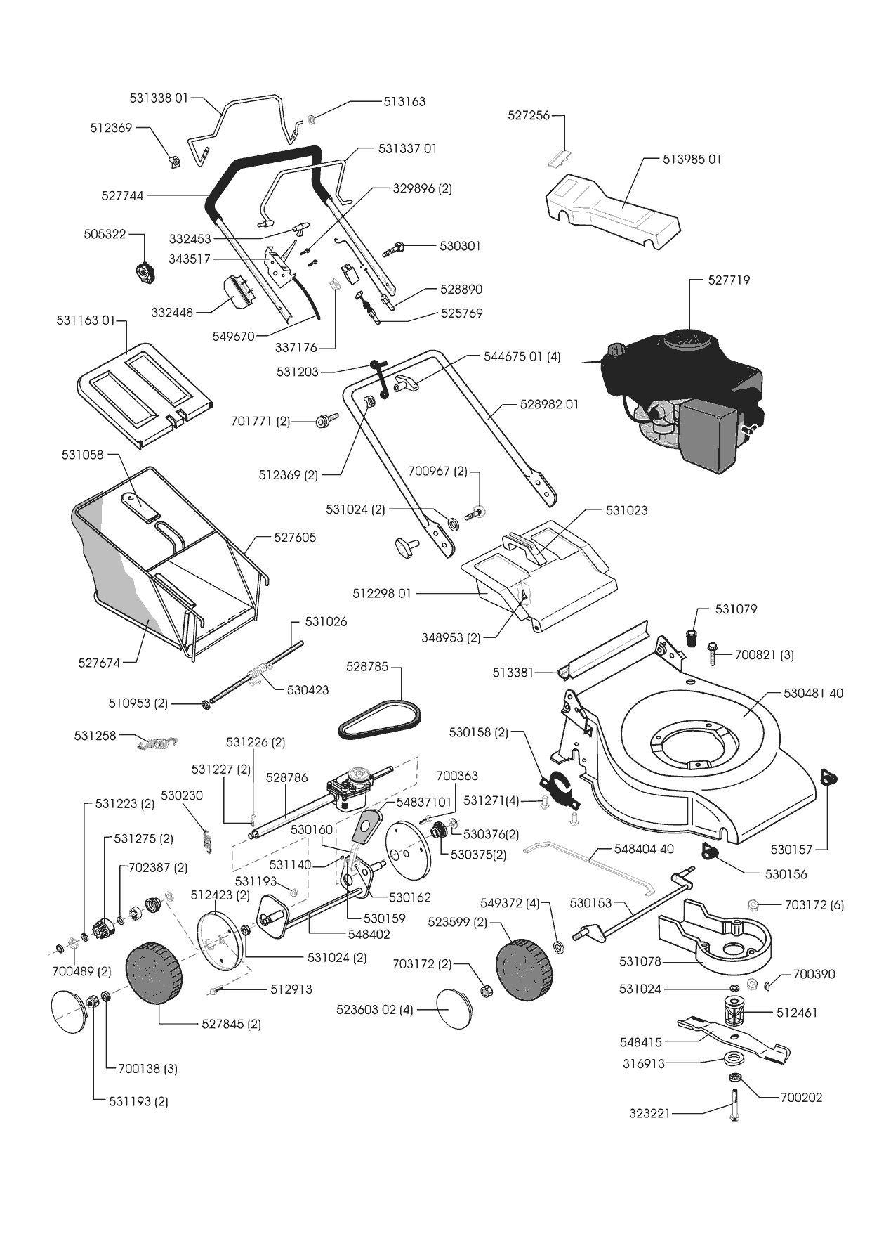 Zeichnungen von Euro Line Benzinrasenmäher 5300 HR 02/2001 - 02/2002 mit der Geräte-Artikelnr. 120866: