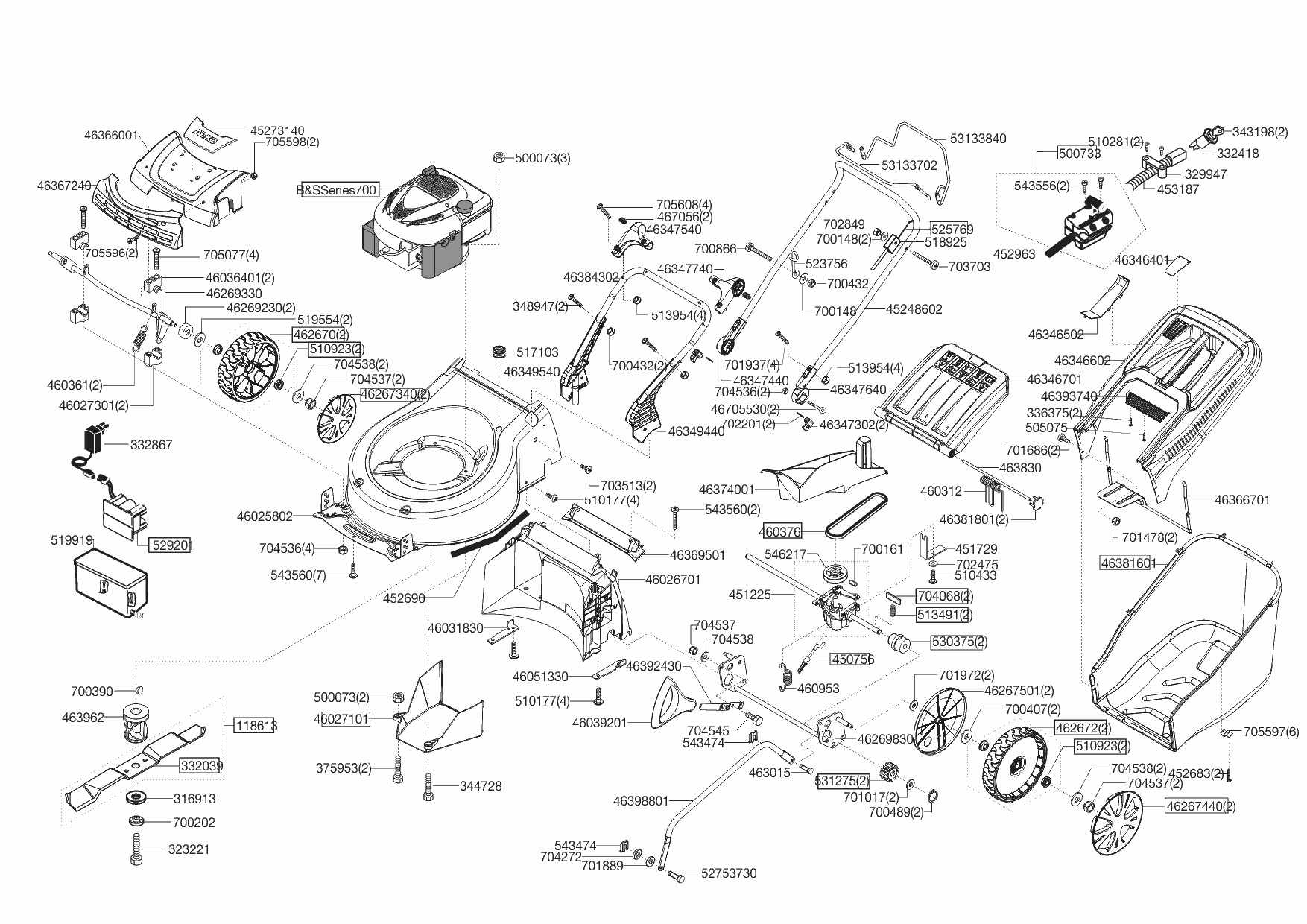 Zeichnungen von Powerline Benzinrasenmäher 4700 BRE 02/2011 - 04/2012 mit der Geräte-Artikelnr. 119187: