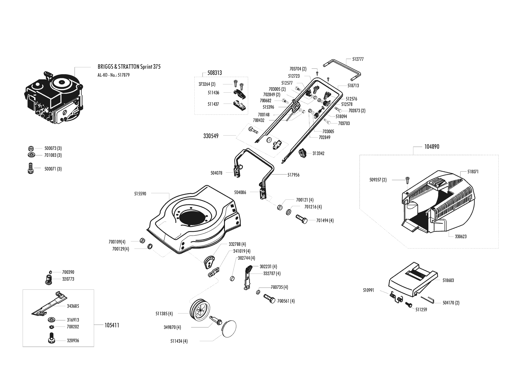 Zeichnungen von Gardol Benzinrasenmäher 400 B 05/1995 - 04/1997 mit der Geräte-Artikelnr. 117185: