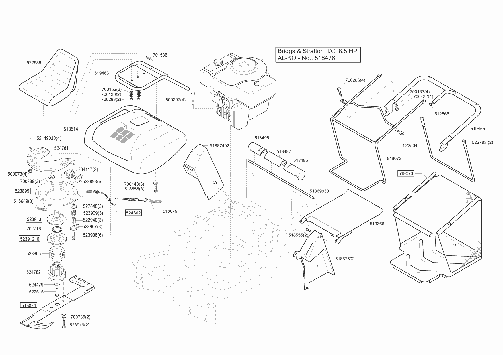 Zeichnungen von Master Aufsitzmäher Rider 9-55 08/2002 - 10/2004 mit der Geräte-Artikelnr. 117127: