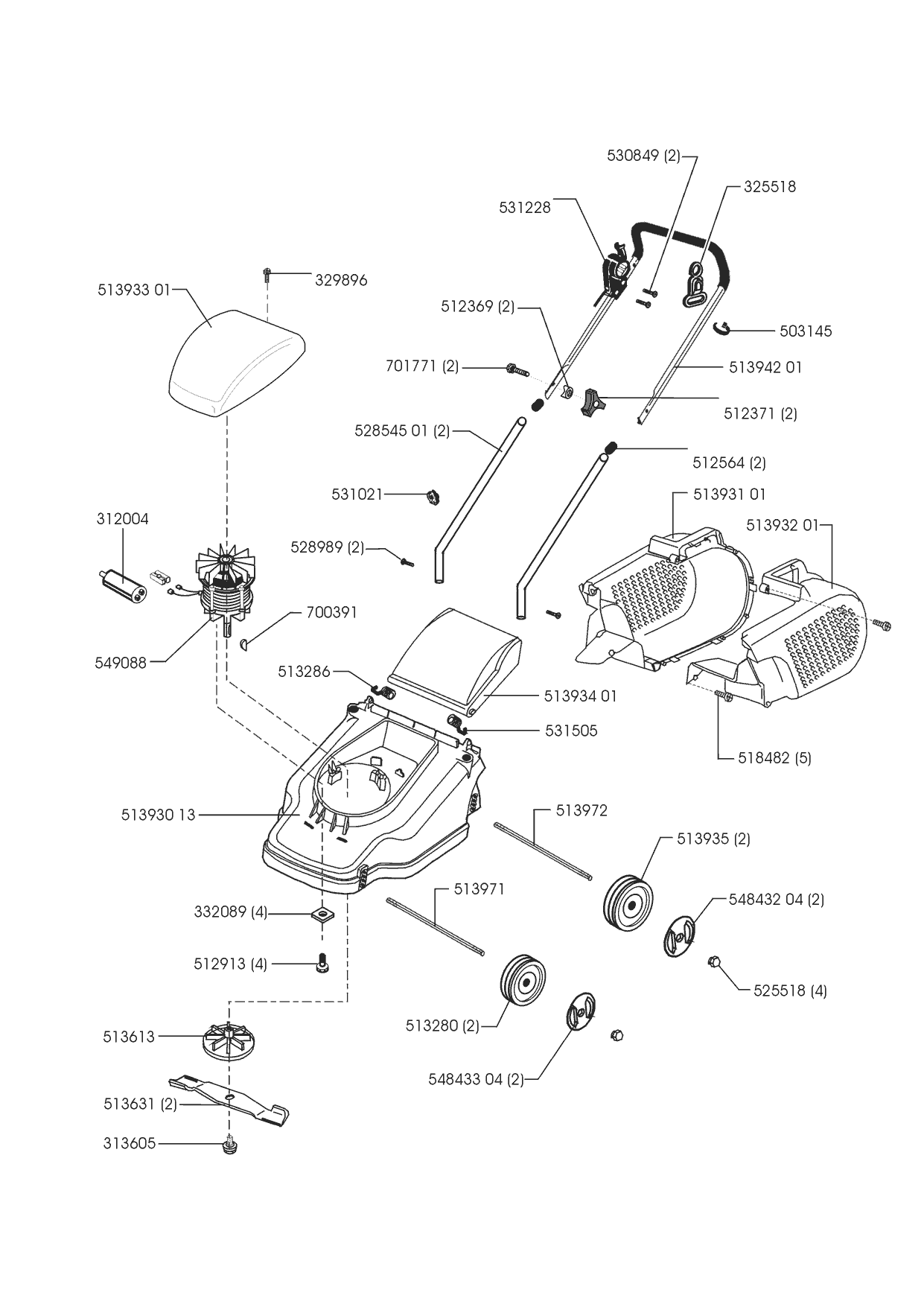 Zeichnungen von Hanseatic Elektrorasenmäher 38 E 12/1999 - 11/2000 mit der Geräte-Artikelnr. 120945: