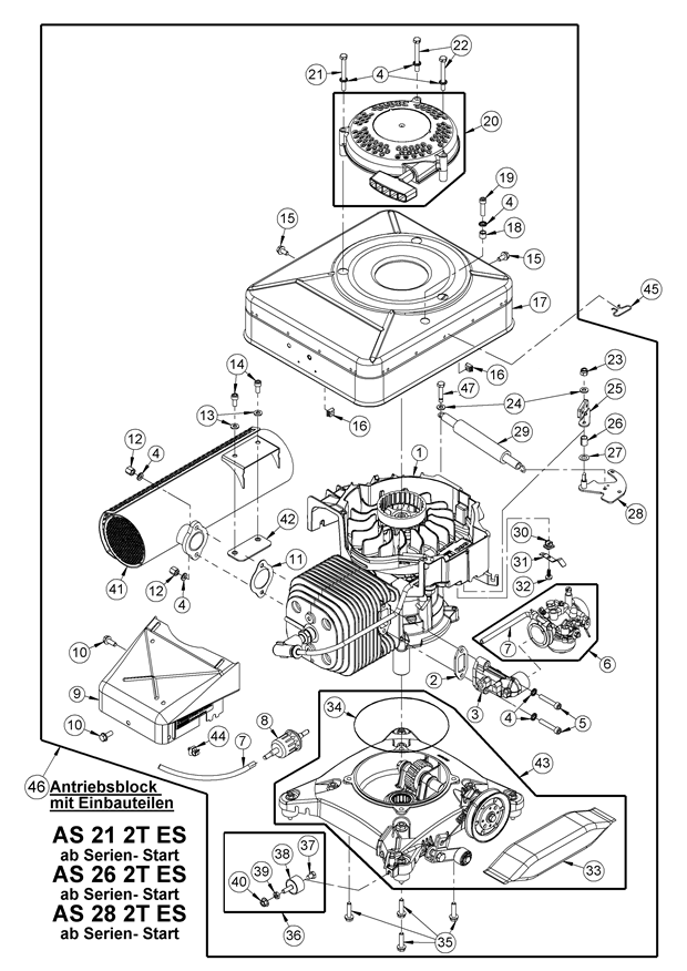 Hier finden Sie alle Ersatzteile von AS-Motor Allmäher AS 28 2T ES ab FNr. 027916070001 aus dem Zeichnungsblatt Antriebsblock:
