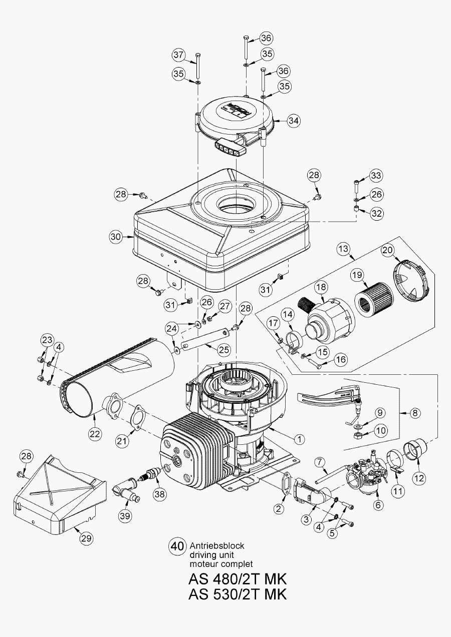 Hier finden Sie alle Ersatzteile von AS-Motor Profi-Rasenmäher AS 530/2T MK ab FNr. 019407202001 aus dem Zeichnungsblatt Antriebsblock:
