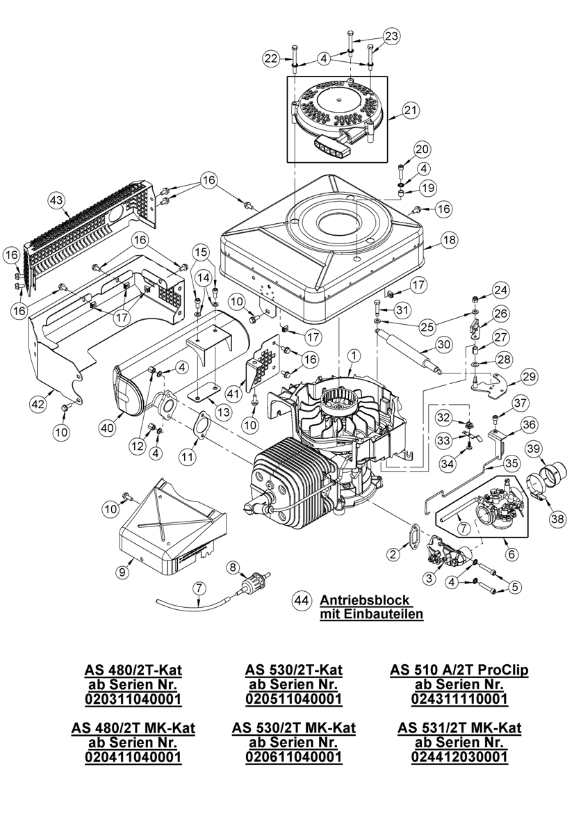 Hier finden Sie alle Ersatzteile von AS-Motor Profi-Rasenmäher AS 530/2T MK-Kat ab FNr. 020611040001 aus dem Zeichnungsblatt Antriebsblock: