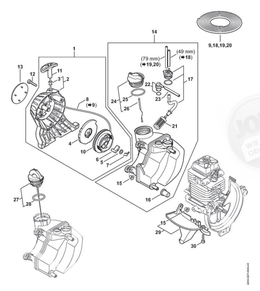 Hier finden Sie alle Ersatzteile von Stihl Heckenscheren HL 95 der Zeichnungsgruppe Anwerfvorrichtung, Kraftstofftank:
