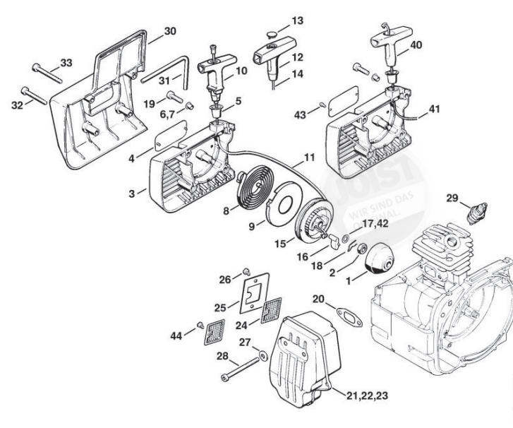Hier finden Sie alle Ersatzteile von Stihl Motorsensen und Freischneider FS 280 K der Zeichnungsgruppe Anwerfvorrichtung, Schalldämpfer:
