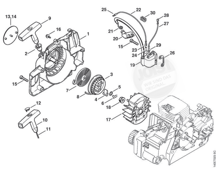 Hier finden Sie alle Ersatzteile von Stihl Benzin-Motorsägen 018 der Zeichnungsgruppe Anwerfvorrichtung, Zündanlage:
