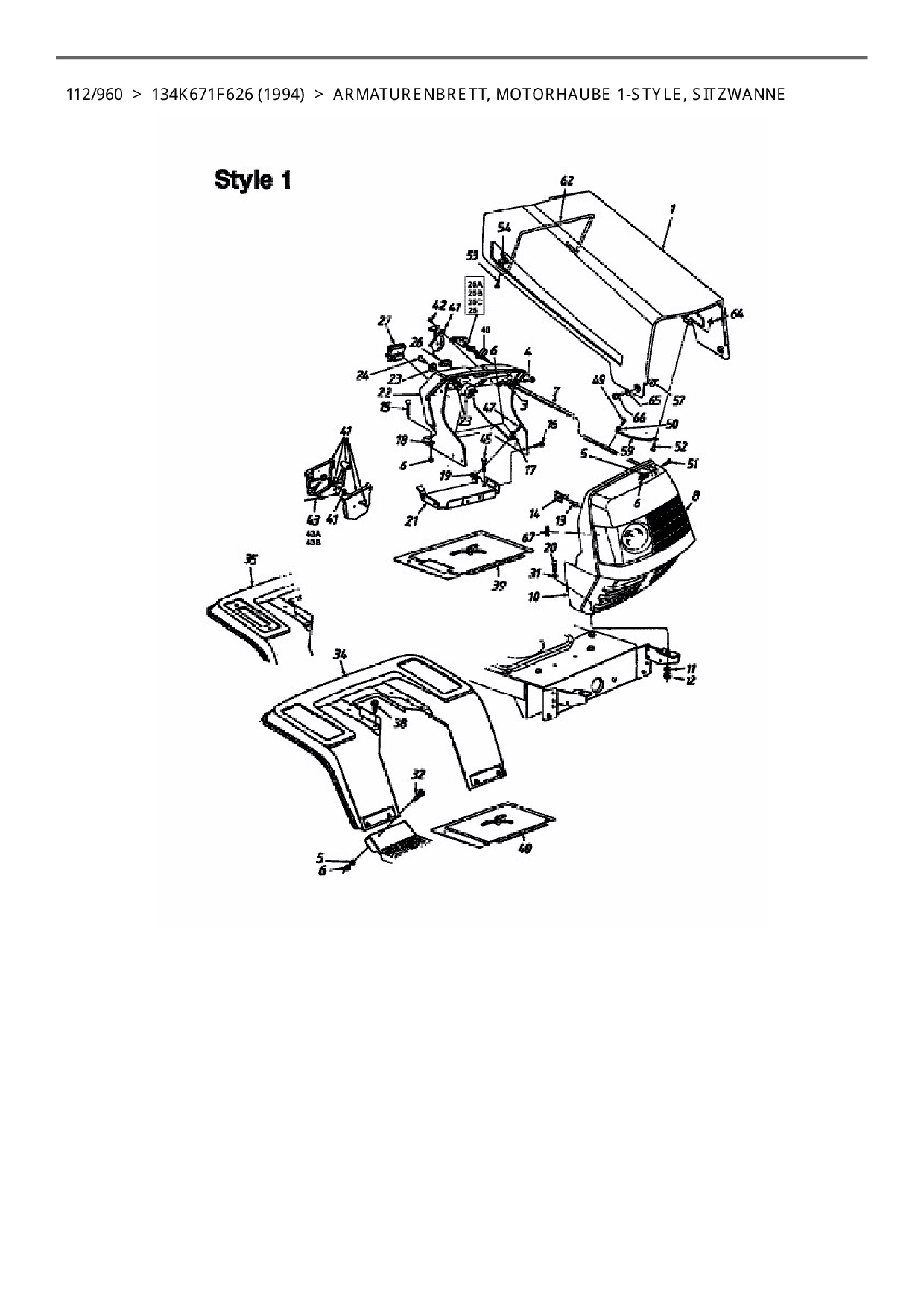 Ersatzteile für Rasentraktor Columbia 112/960 aus der Zeichnung Armaturenbrett, Motorhaube 1-Style, Sitzwanne: