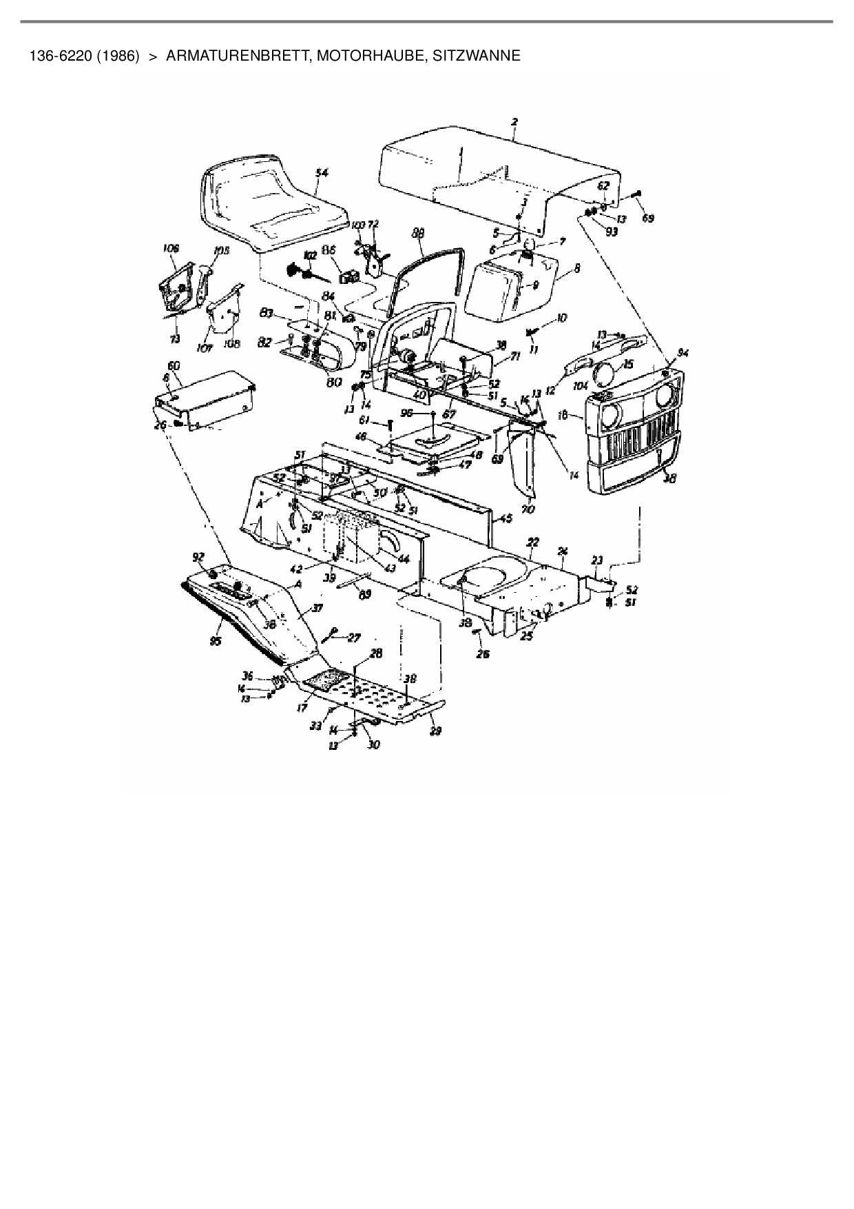 Ersatzteile für Rasentraktor Columbia 110/760 HA aus der Zeichnung Armaturenbrett, Motorhaube, Sitzwanne: