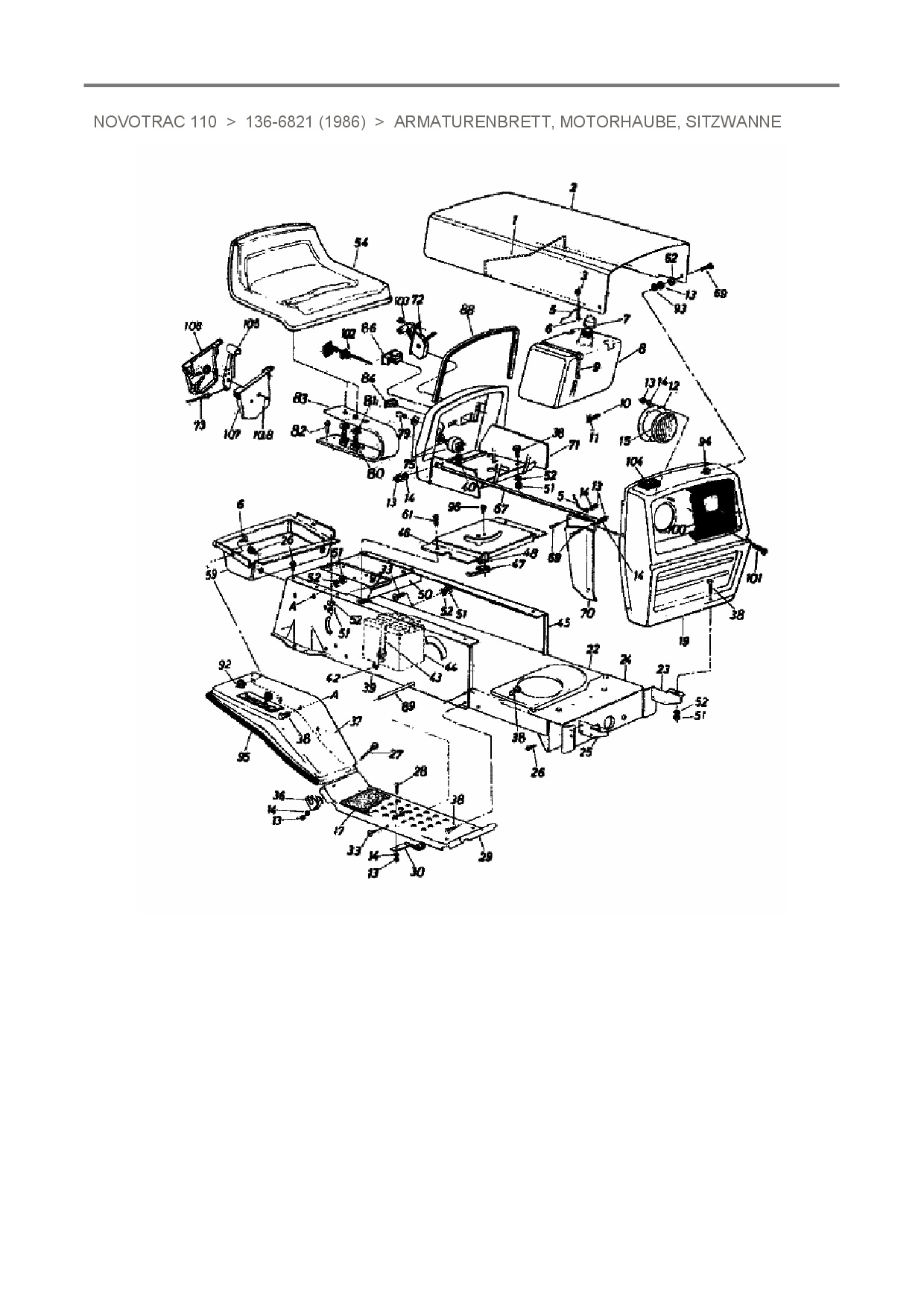 Ersatzteile für Rasentraktor Novotrac NOVOTRAC 110 aus der Zeichnung Armaturenbrett, Motorhaube, Sitzwanne: