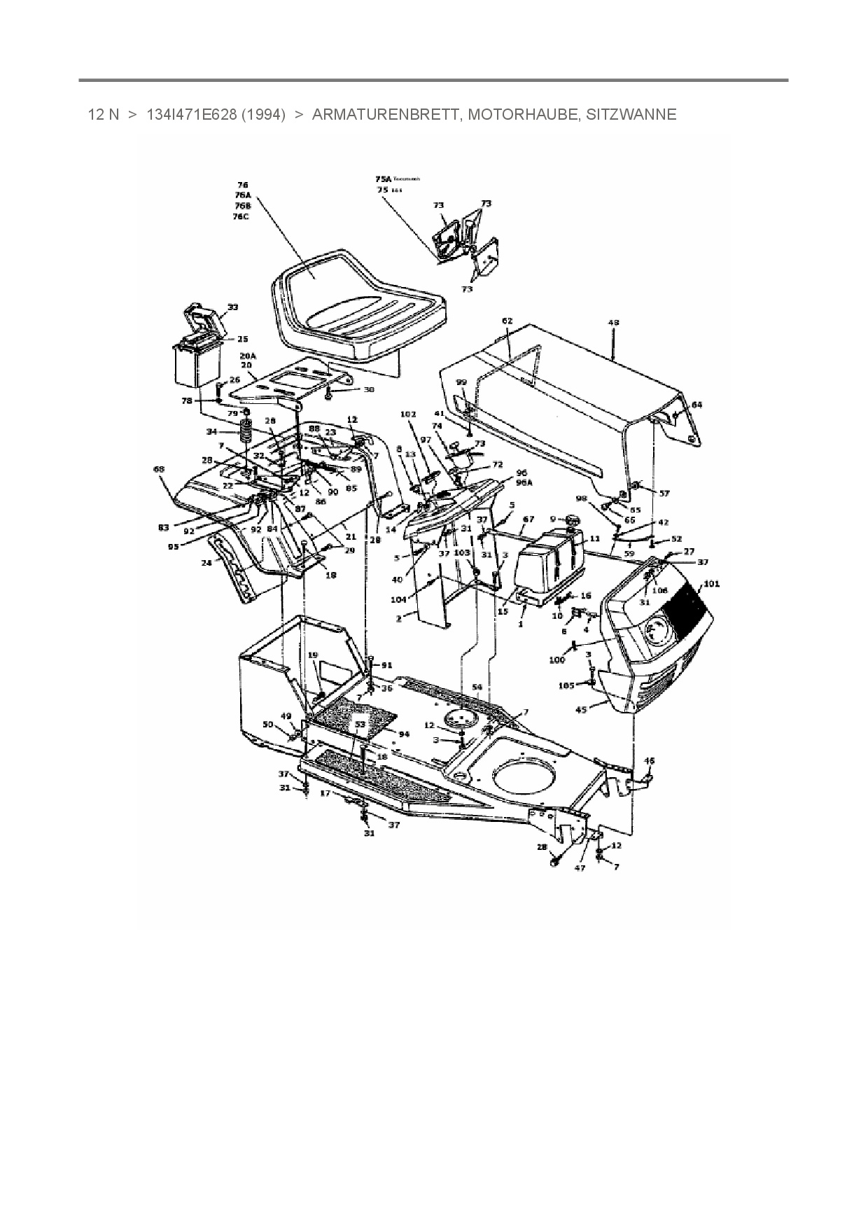 Ersatzteile für Rasentraktor Raiffeisen 12 N aus der Zeichnung Armaturenbrett, Motorhaube, Sitzwanne: