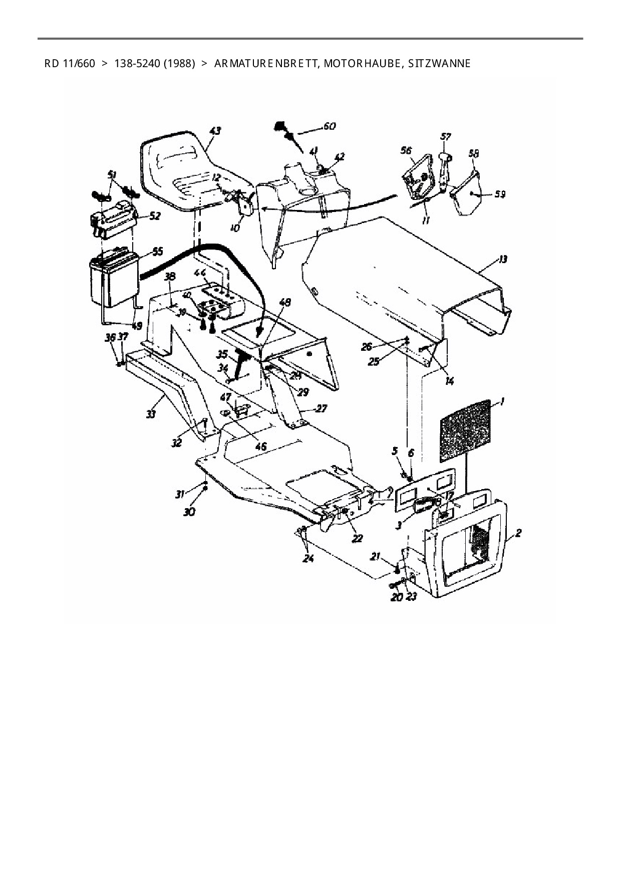 Ersatzteile für Rasentraktor Columbia RD 11/660 aus der Zeichnung Armaturenbrett, Motorhaube, Sitzwanne: