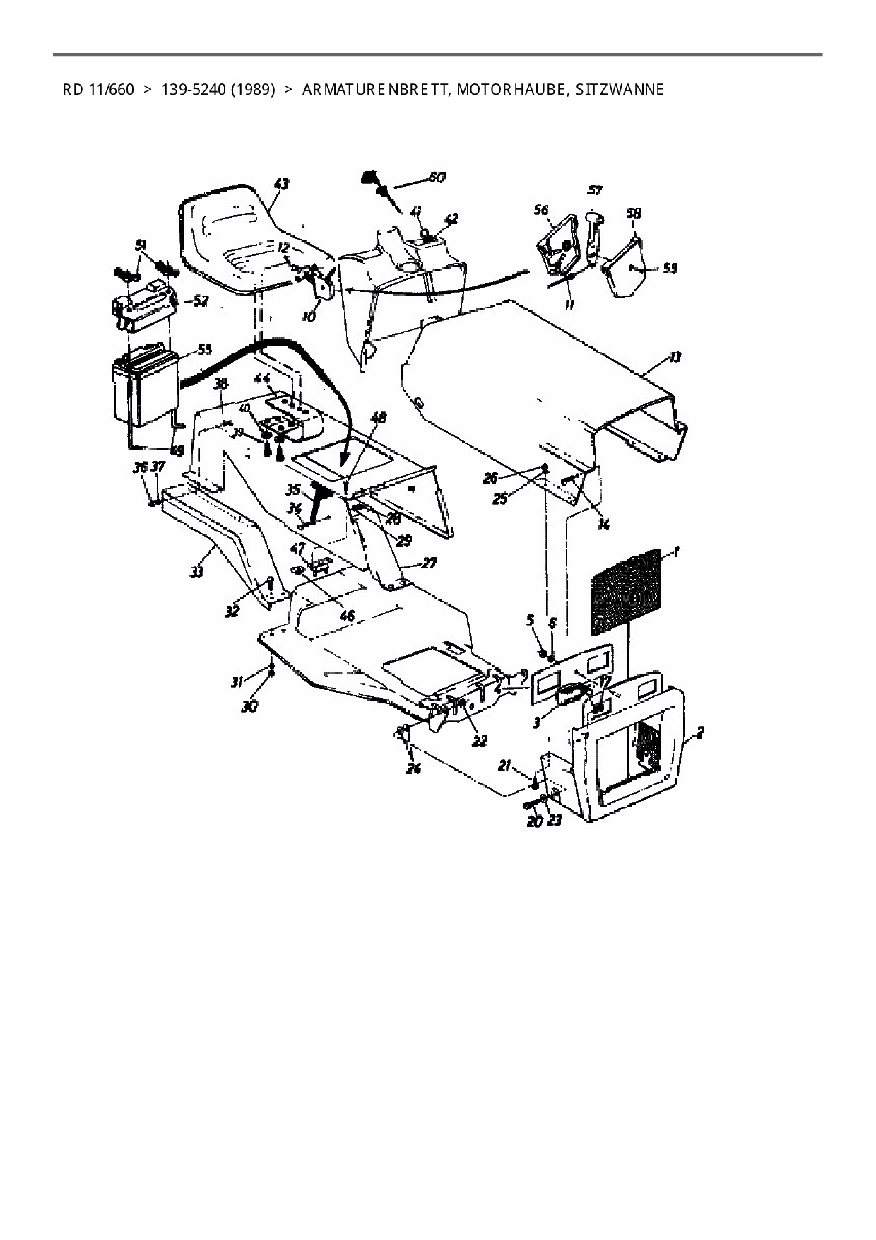 Ersatzteile für Rasentraktor Columbia RD 11/660 aus der Zeichnung Armaturenbrett, Motorhaube, Sitzwanne:
