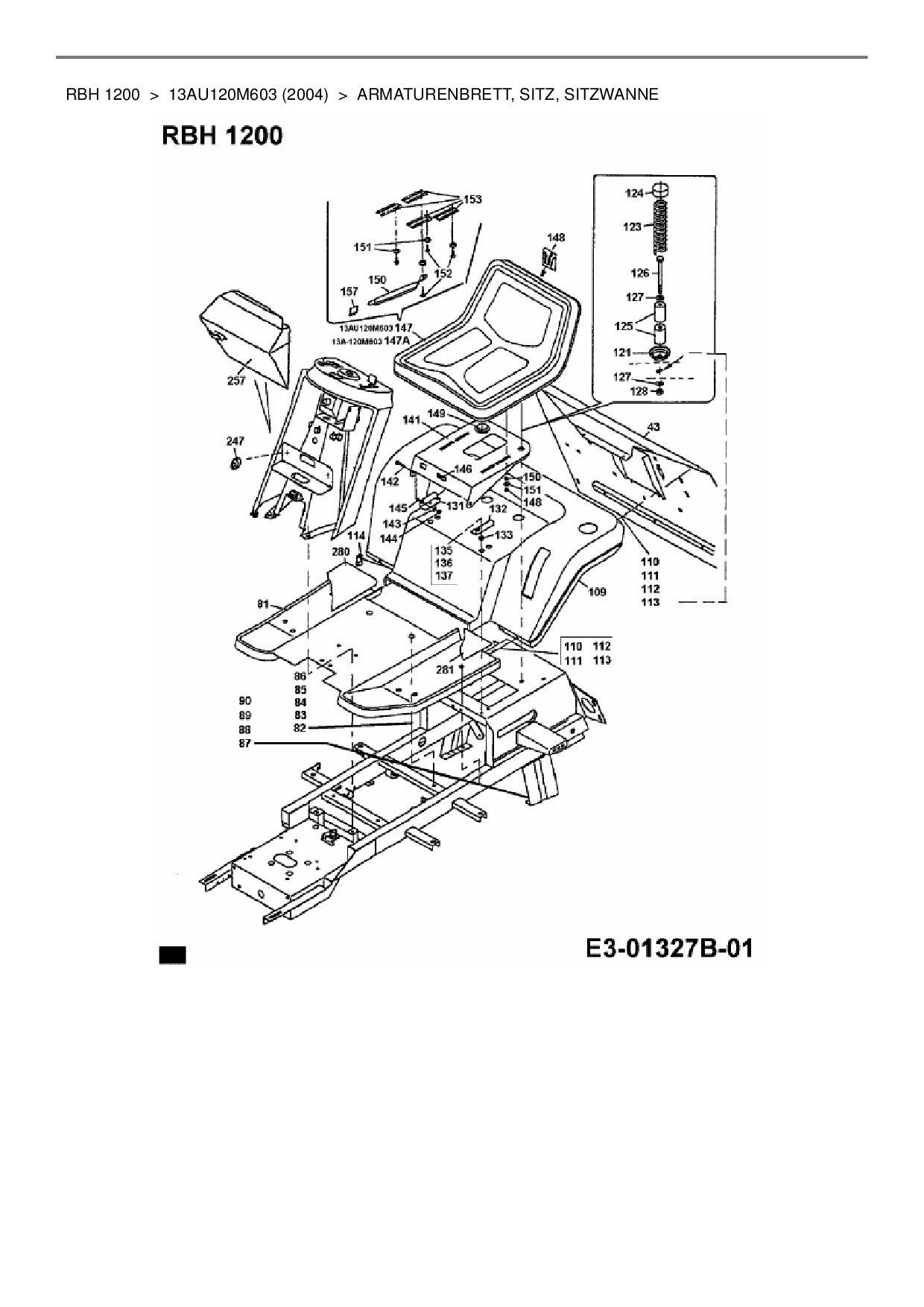 Ersatzteile für Rasentraktor Cub Cadet RBH 1200 aus der Zeichnung Armaturenbrett, Sitz, Sitzwanne: