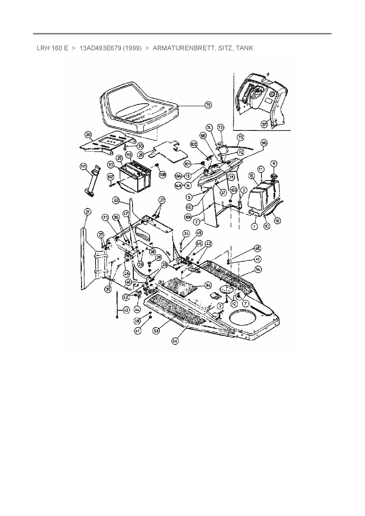 Ersatzteile für Rasentraktor White LRH 160 E aus der Zeichnung Armaturenbrett, Sitz, Tank: