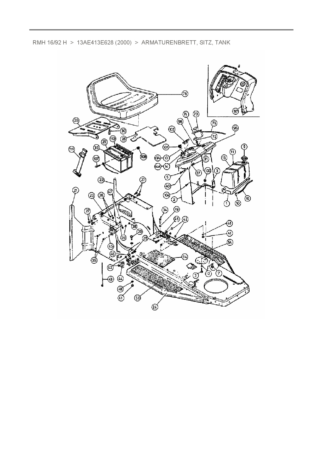 Ersatzteile für Rasentraktor Raiffeisen RMH 16/92 H aus der Zeichnung Armaturenbrett, Sitz, Tank: