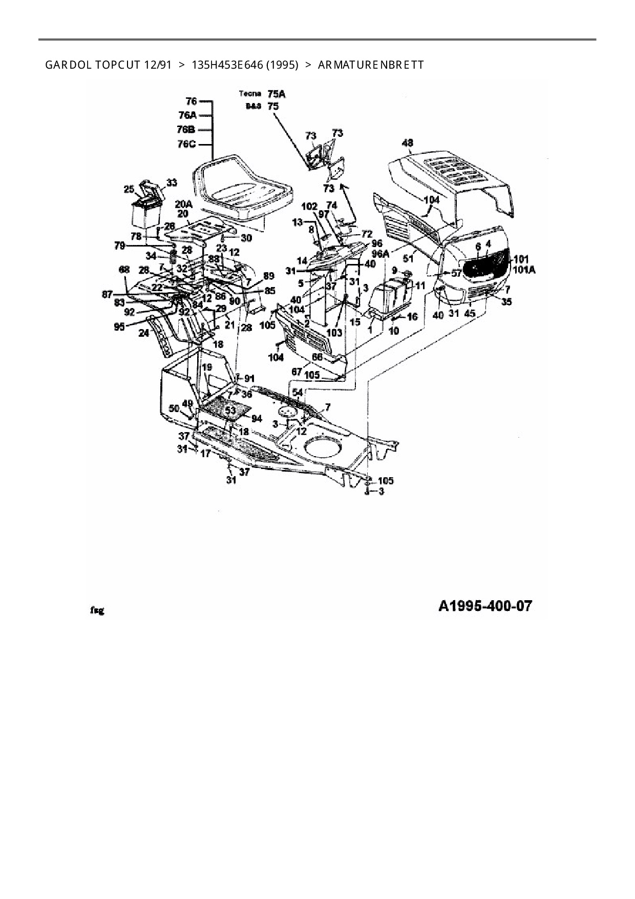 Zeichnung für Bauhaus Rasentraktor Gardol Topcut 12/91 mit der Geräte-Artikelnr. 135H453E646 ab Baujahr 1995: