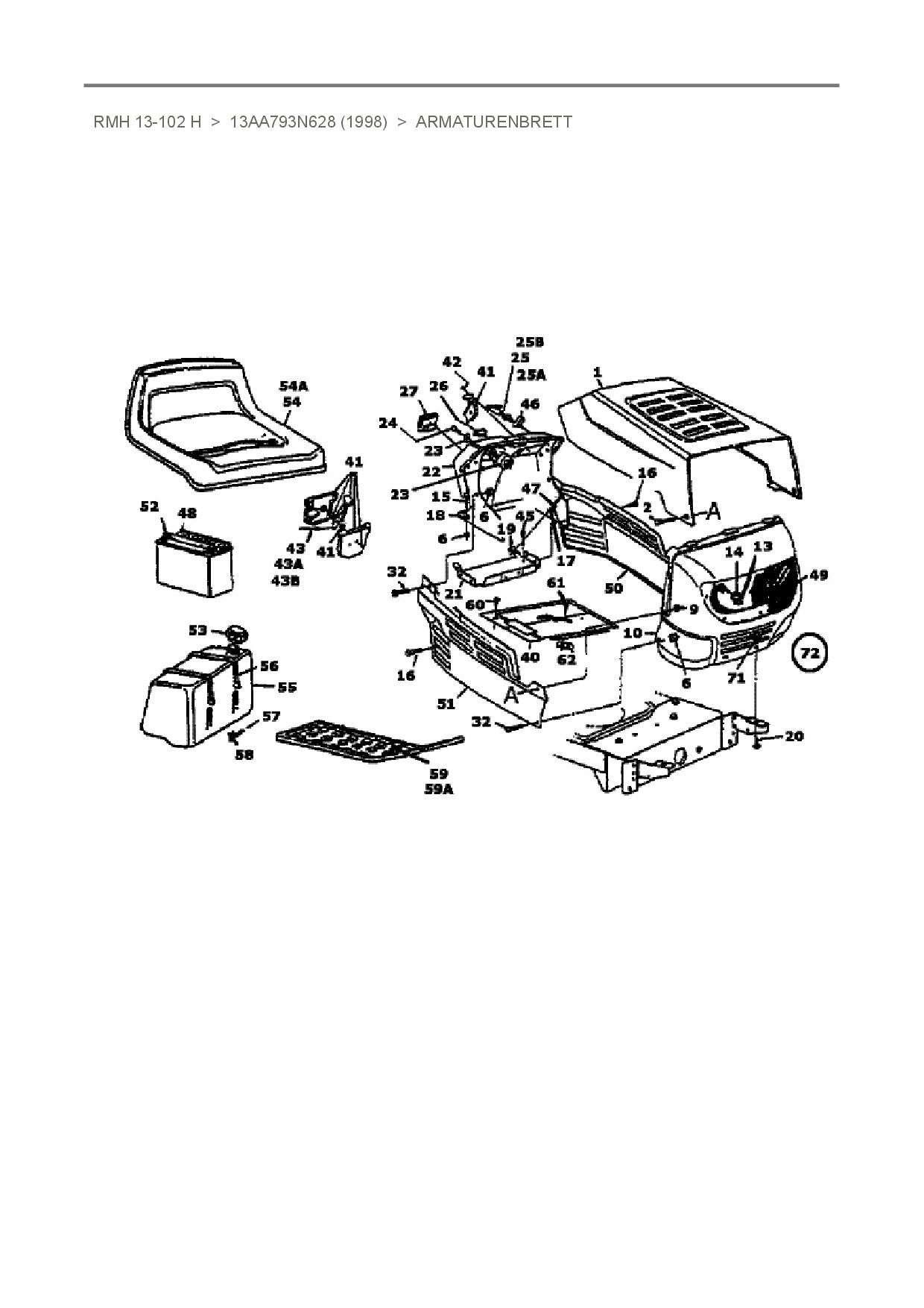 Zeichnung für Raiffeisen Rasentraktor RMH 13-102 H mit der Geräte-Artikelnr. 13AA793N628 ab Baujahr 1998: