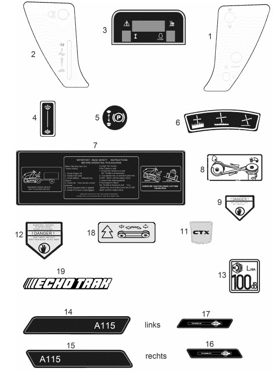 Zeichnung von ECHO-Motorgeräte Rasentraktoren A-Serie A-115KO - E1100007 Aufkleber A-115KO: