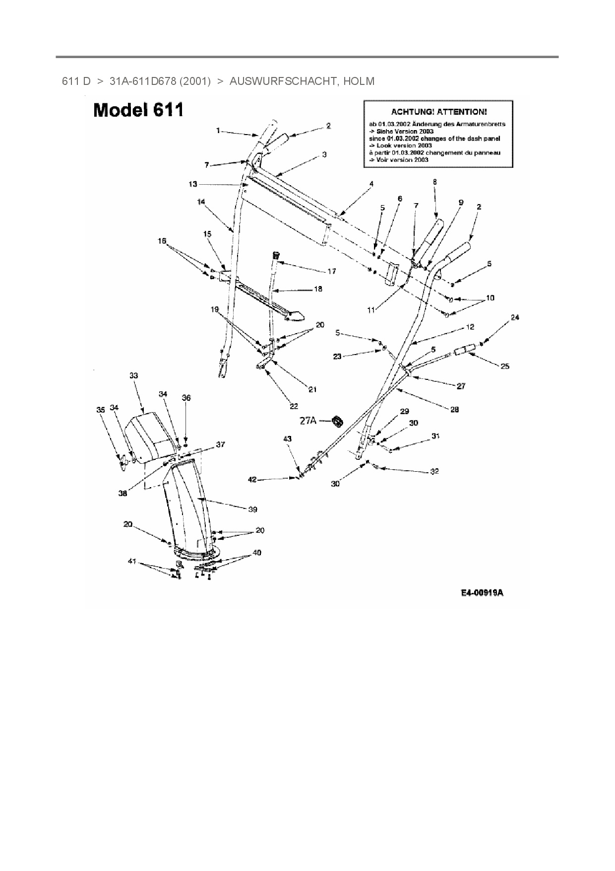 Ersatzteile für Schneefräse MTD 611 D aus der Zeichnung Auswurfschacht, Holm: