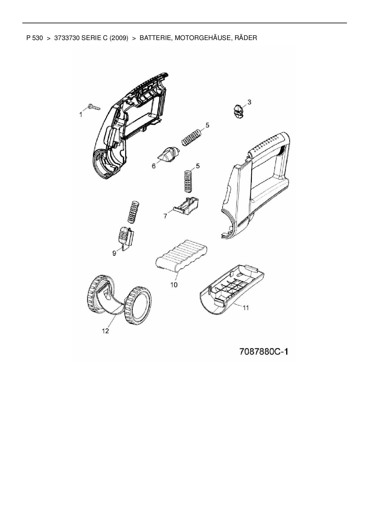Ersatzteile für Akkuschere Wolf-Garten P 530 aus der Zeichnung Batterie, Motorgehäuse, Räder: