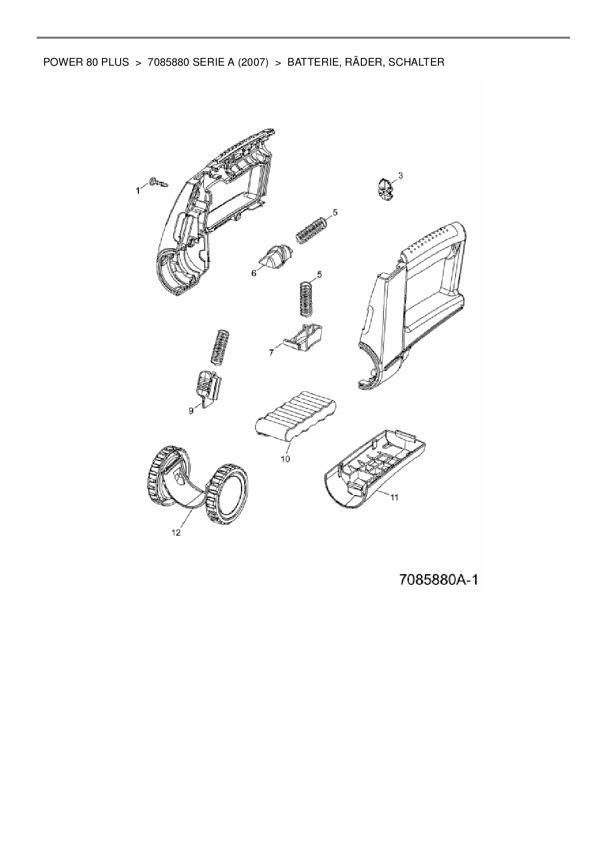Ersatzteile für Akkuschere Wolf-Garten Power 80 plus aus der Zeichnung Batterie, Räder, Schalter: