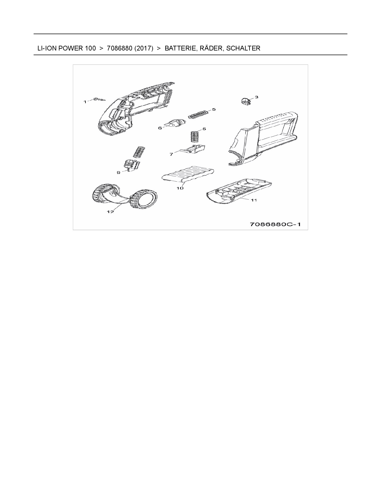 Ersatzteile für Akkuschere Wolf-Garten Li-Ion Power 100 aus der Zeichnung Batterie, Räder, Schalter: