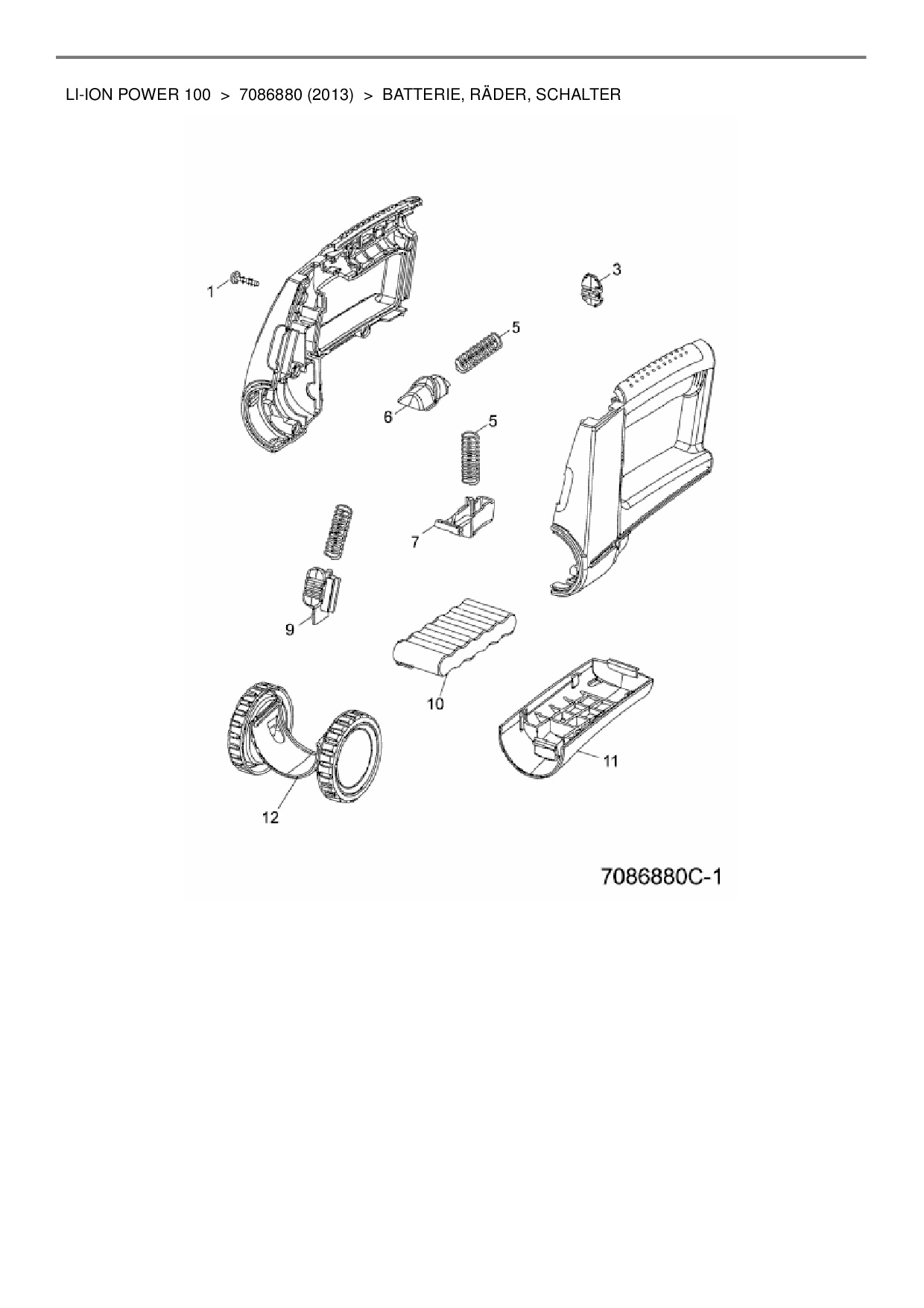 Ersatzteile für Akkuschere Wolf-Garten Li-Ion Power 100 aus der Zeichnung Batterie, Räder, Schalter: