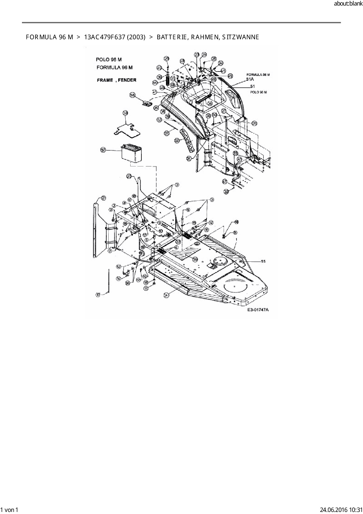 Ersatzteile für Rasentraktor EFCO Formula 96 M aus der Zeichnung Batterie, Rahmen, Sitzwanne: