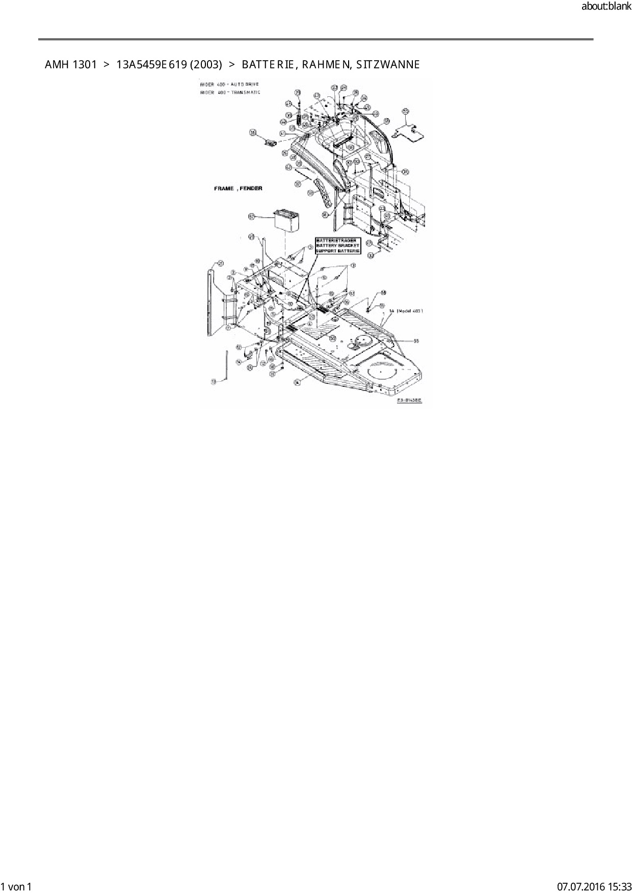 Ersatzteile für Rasentraktor FLEURELLE AMH 1301 aus der Zeichnung Batterie, Rahmen, Sitzwanne: