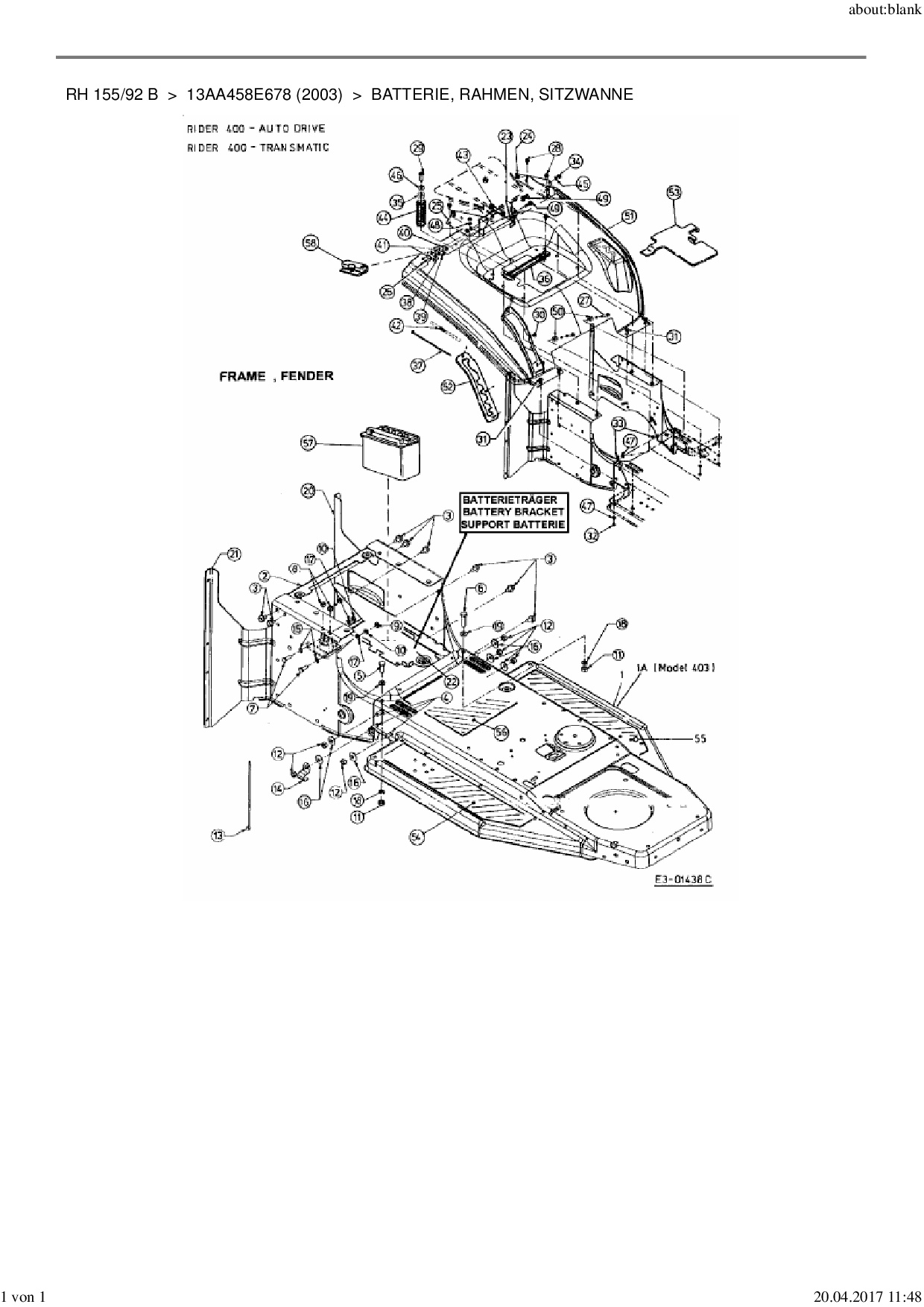 Ersatzteile für Rasentraktor MTD RH 155/92 B aus der Zeichnung Batterie, Rahmen, Sitzwanne: