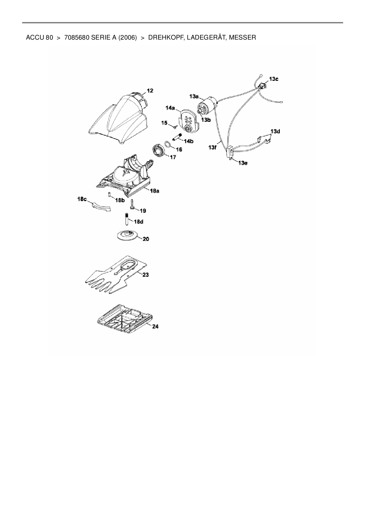 Download Ersatzteil-Zeichnung Wolf-Garten Accu 80 Zeichnung Drehkopf, Ladegerät, Messer (PDF-Format)