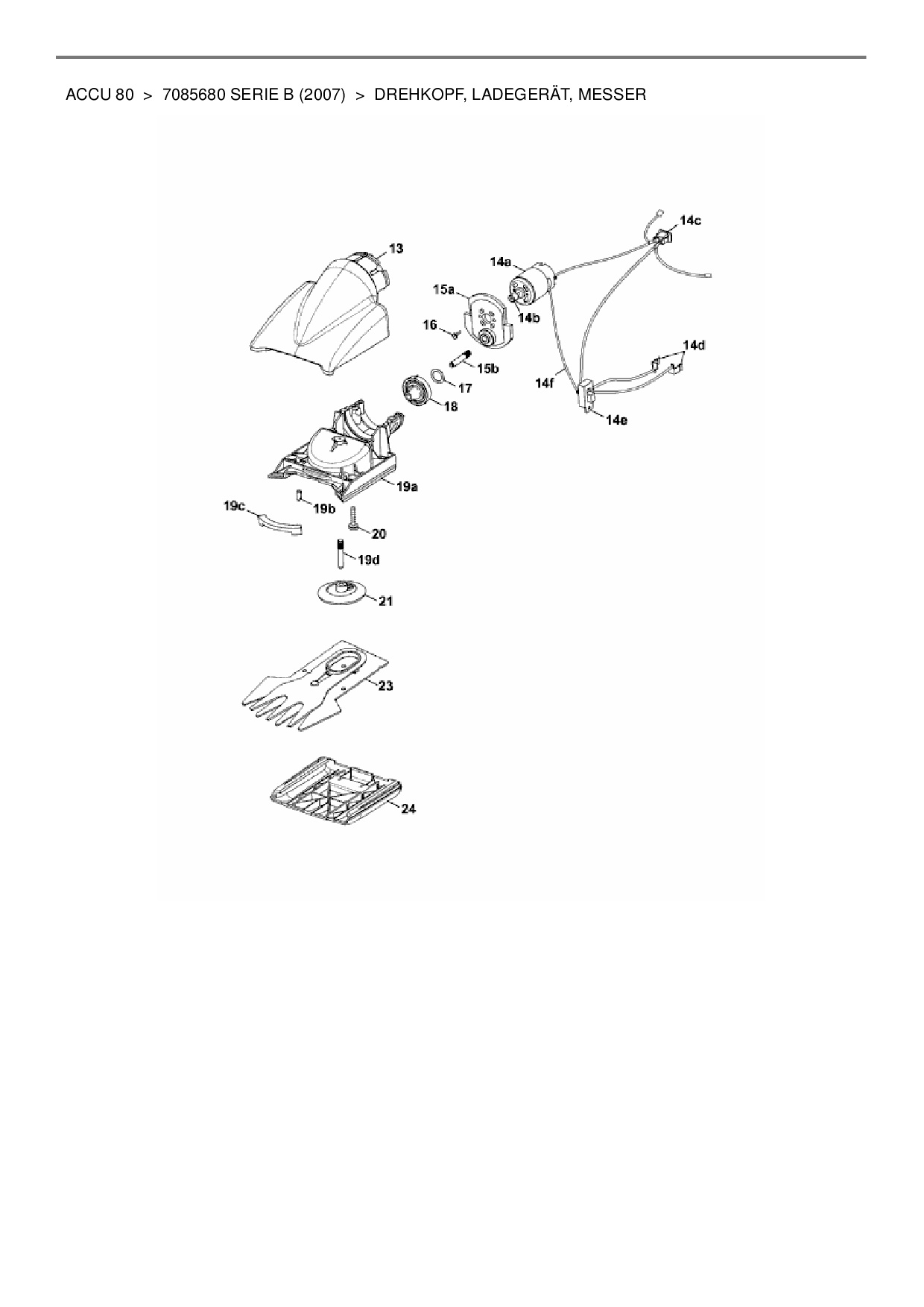 Download Ersatzteil-Zeichnung Wolf-Garten Accu 80 Zeichnung Drehkopf, Ladegerät, Messer (PDF-Format)