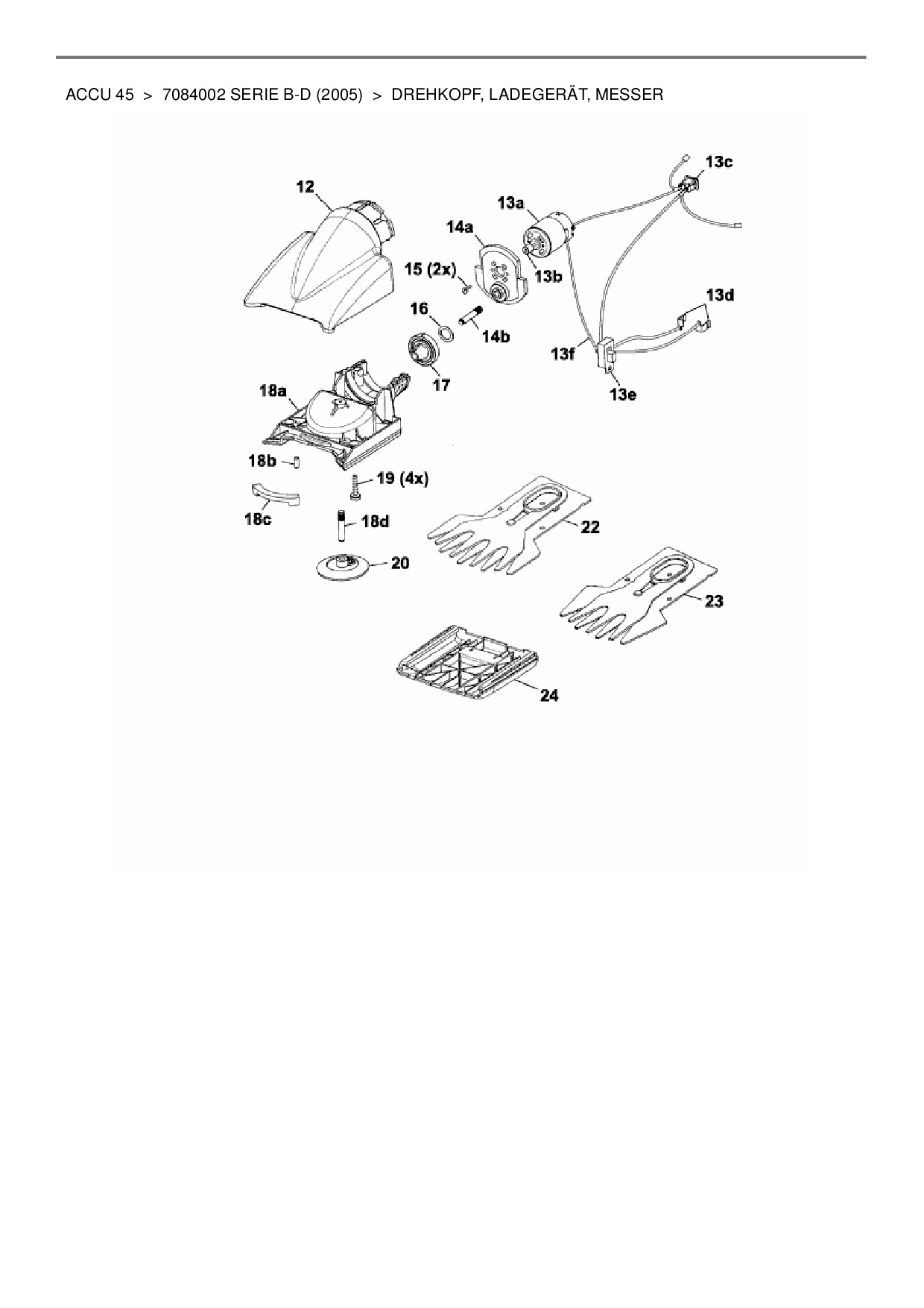 Download Ersatzteil-Zeichnung Wolf-Garten Accu 45 Zeichnung Drehkopf, Ladegerät, Messer (PDF-Format)
