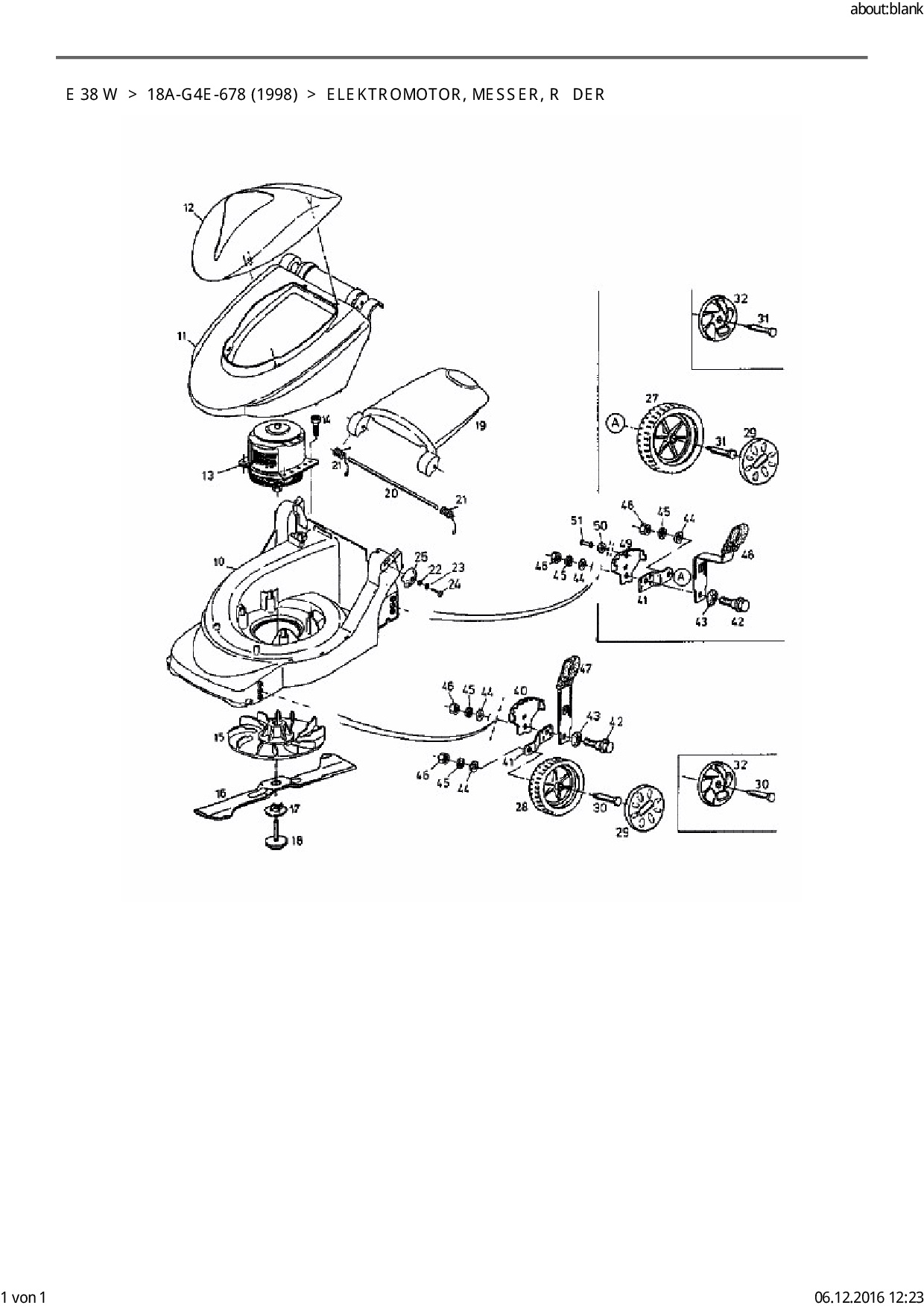 Ersatzteile für Elektromäher MTD E 38 W aus der Zeichnung Elektromotor, Messer, Räder: