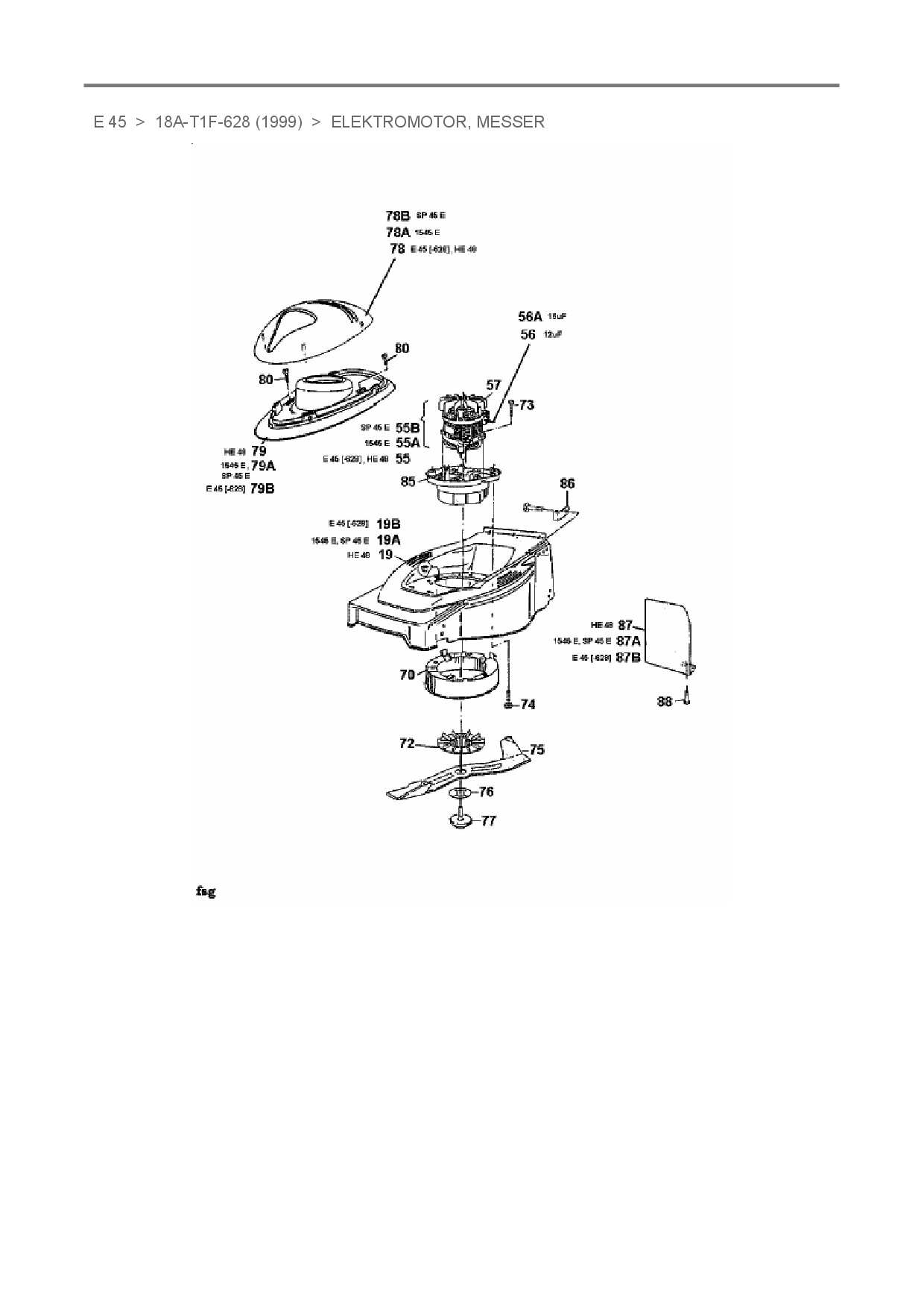 Zeichnung für Raiffeisen Elektromäher E 45 mit der Geräte-Artikelnr. 18A-T1F-628 ab Baujahr 1999: