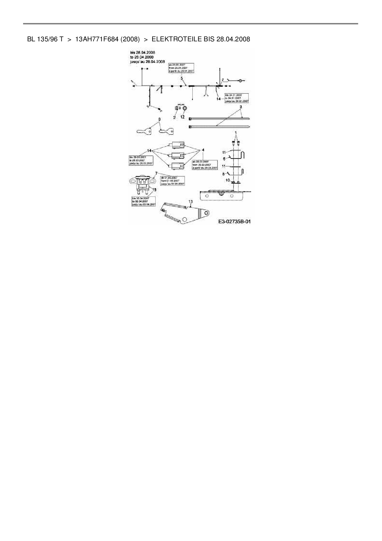Ersatzteile für Rasentraktor Bolens BL 135/96 T aus der Zeichnung Elektroteile bis 28.04.2008: