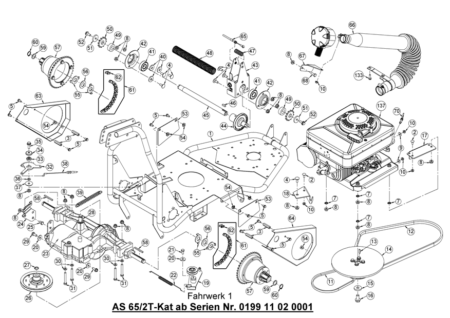 Hier finden Sie alle Ersatzteile von AS-Motor Allmäher AS 65 2T und AS 65/2T-Kat ab FNr. 019911020001 aus dem Zeichnungsblatt Fahrwerk Abb.1: