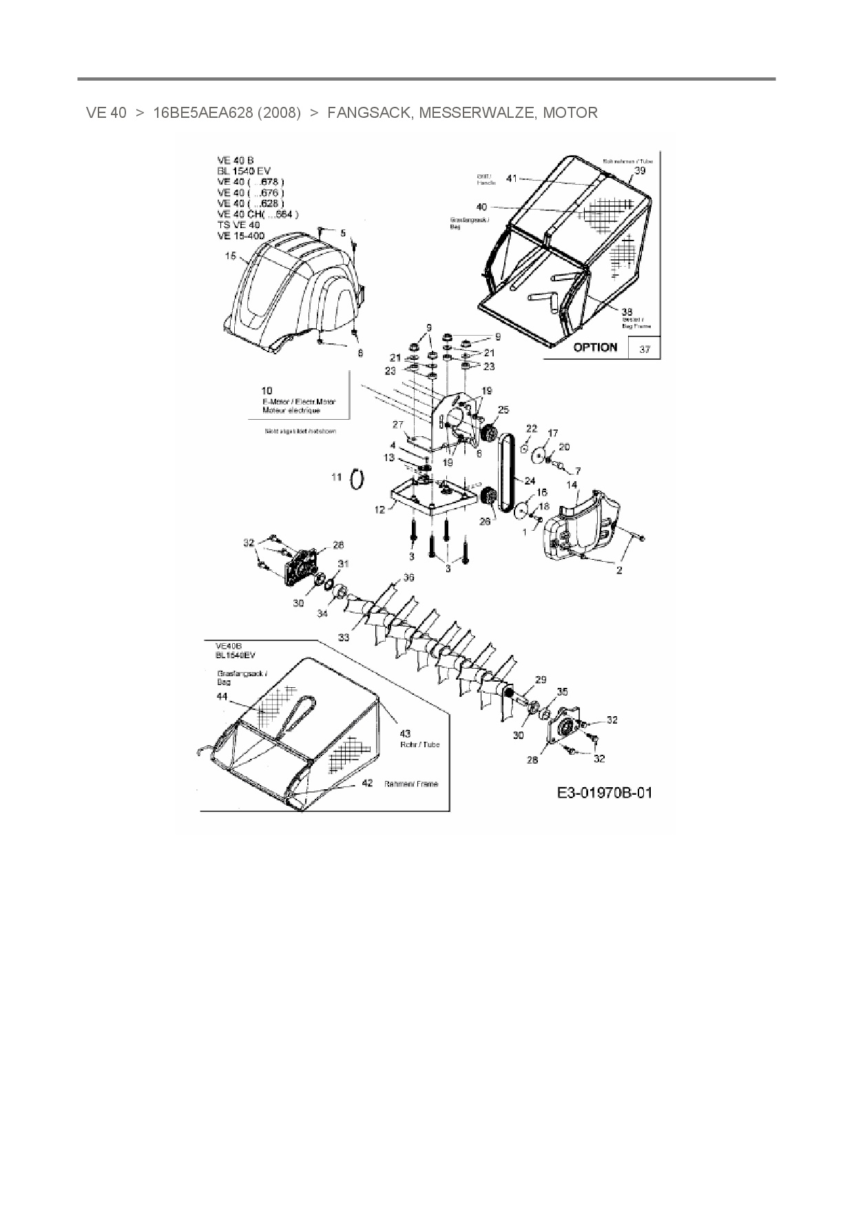 Ersatzteile für Elektrovertikutierer Raiffeisen VE 40 aus der Zeichnung Fangsack, Messerwalze, Motor: