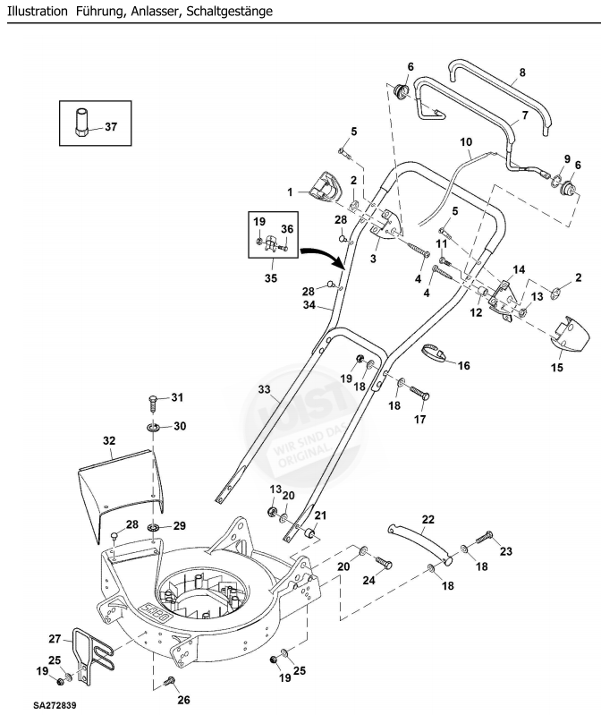 Zeichnung Sabo Rasenmäher Profi-Rasenmäher 43-PRO S EDV-NR. SA301119 Führung, Anlasser, Schaltgestänge: