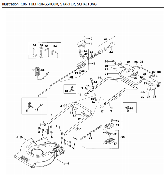 Zeichnung Sabo Rasenmäher Benzin-Rasenmäher 52-QHE M.A. TURBOSTAR EDV-NR.SA232 Führungsholm, Starter, Schaltung: