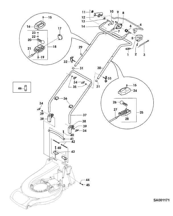 Zeichnung Sabo Rasenmäher Benzin-Rasenmäher 47-OHV VARIO EDV-NR.SA372 Führungsholm, Starter, Schaltung: