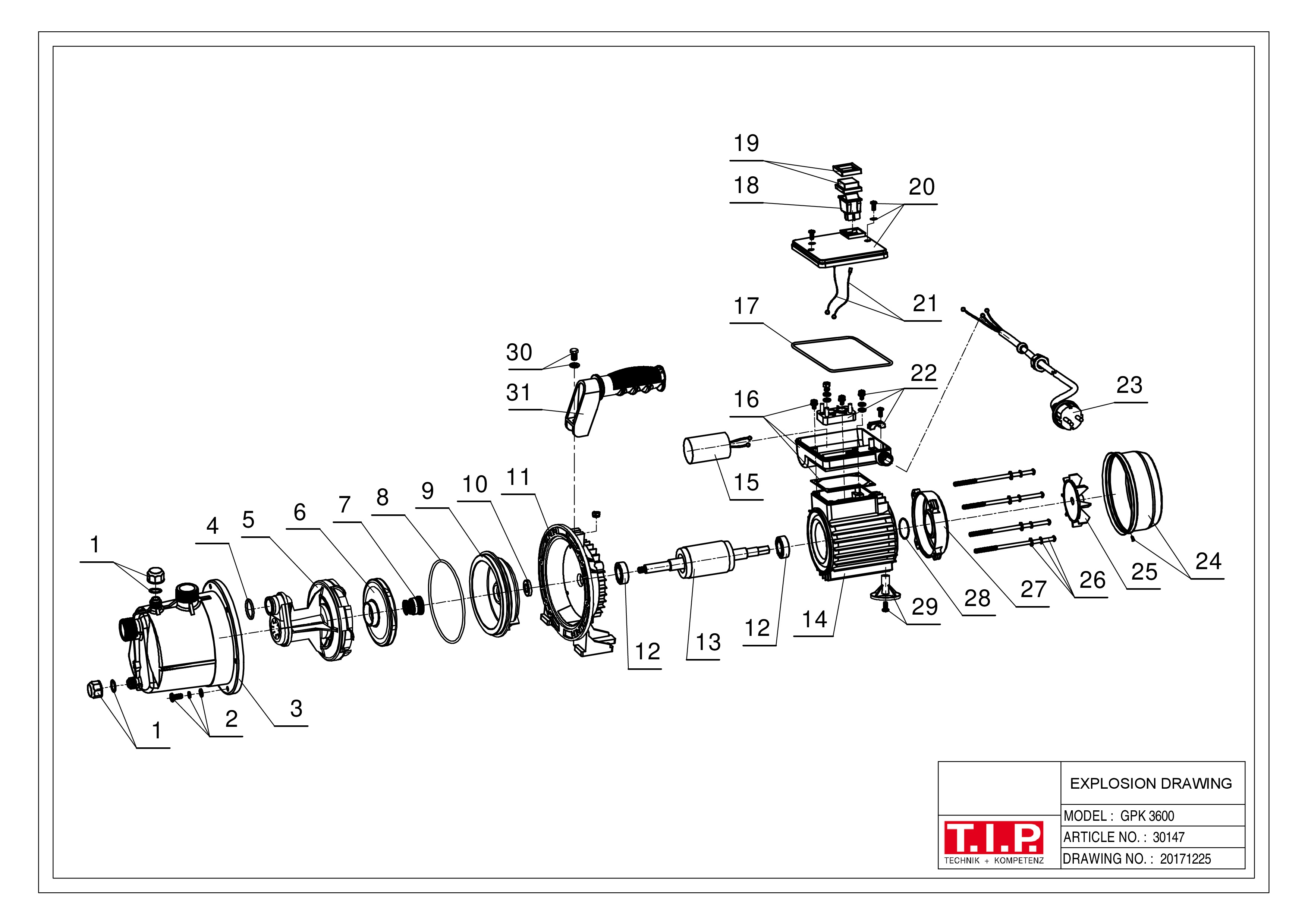 Zeichnung Sollten Sie Fragen zu einem Ersatzteil von T.I.P. Gartenpumpe GPK 3600 haben, können Sie uns gerne eine E-Mail (mit einem Foto vom Typenschild Ihres Gerätes) schreiben oder eine Ersatzteilanfrage stellen.