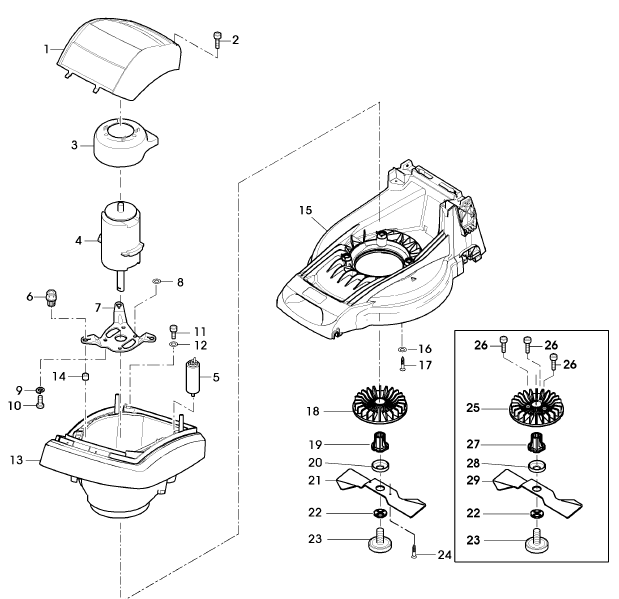 Gehäuse, Motor, Lüfter, Mähwerk