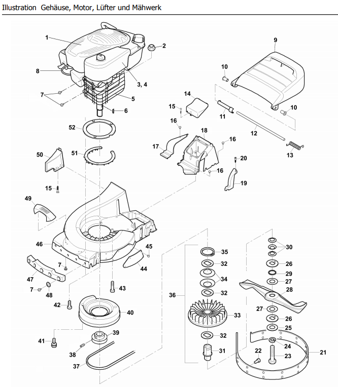 Gehäuse, Motor, Lüfter, Mähwerk