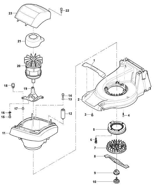 Gehäuse, Motor, Lüfter, Mähwerk