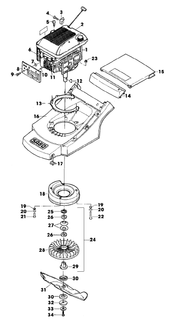Zeichnung Sabo Rasenmäher Benzin-Rasenmäher 43-4 TURBOSTAR EDV-NR. SA132 Gehäuse, Motor, Messerbalken: