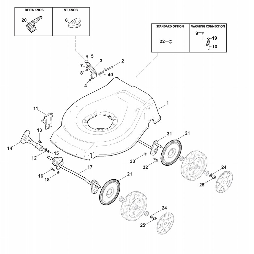 Hier finden Sie alle Ersatzteile von Castelgarden Benzinrasenmäher ab 2018 NT 534 - B (ID 299531023/GLB) aus der Zeichnung Gehäuse und Schnittverstellung: