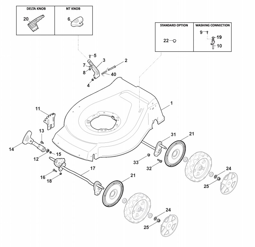 Hier finden Sie alle Ersatzteile von Castelgarden Benzinrasenmäher ab 2019 NT 534 - B (ID 299531023/GLB) aus der Zeichnung Gehäuse und Schnittverstellung: