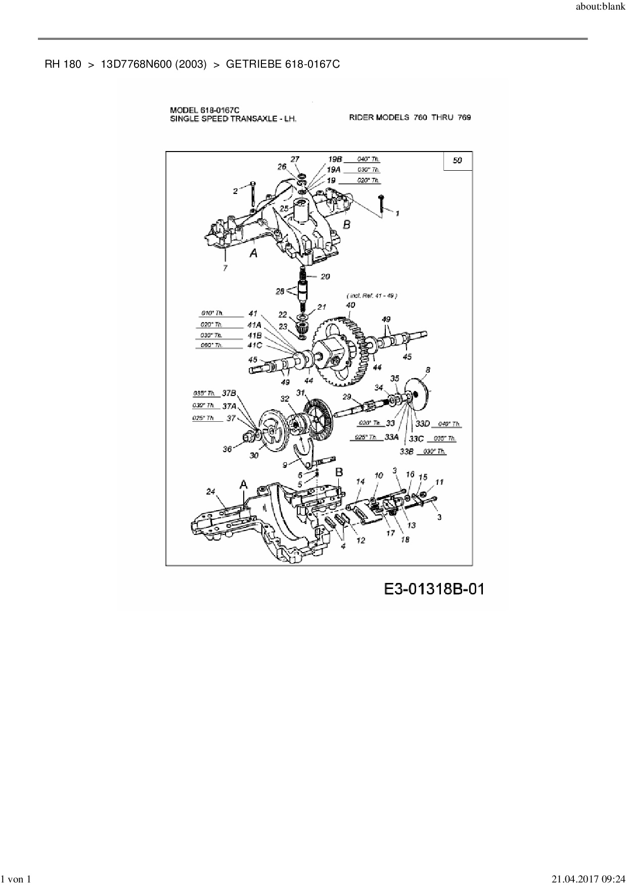 Ersatzteile für Rasentraktor MTD RH 180 aus der Zeichnung Getriebe 618-0167C: